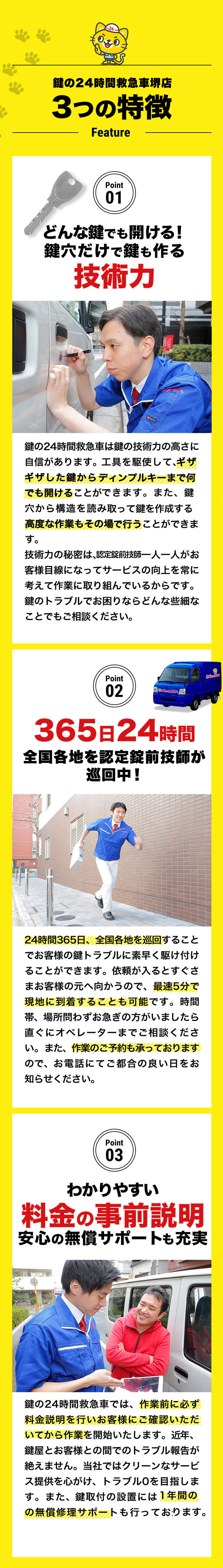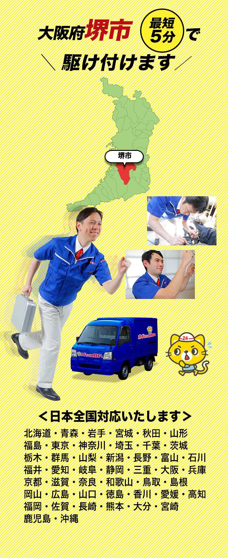 堺の「カギの出張24時間」は、堺市内の鍵トラブルに対応。歴史あるこの地で、伝統に則った丁寧な接客と迅速な鍵対応でお客様の期待に応えます。堺で鍵のプロフェッショナルサービスをお探しの方は、ぜひ当店へ。